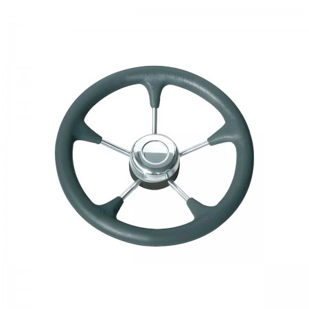 O volante T9R em poliuretano preto macio com raios em aço inoxidável tem um cone universal para compatibilidade com os cabos Ultraflex, Morse ou Teleflex.