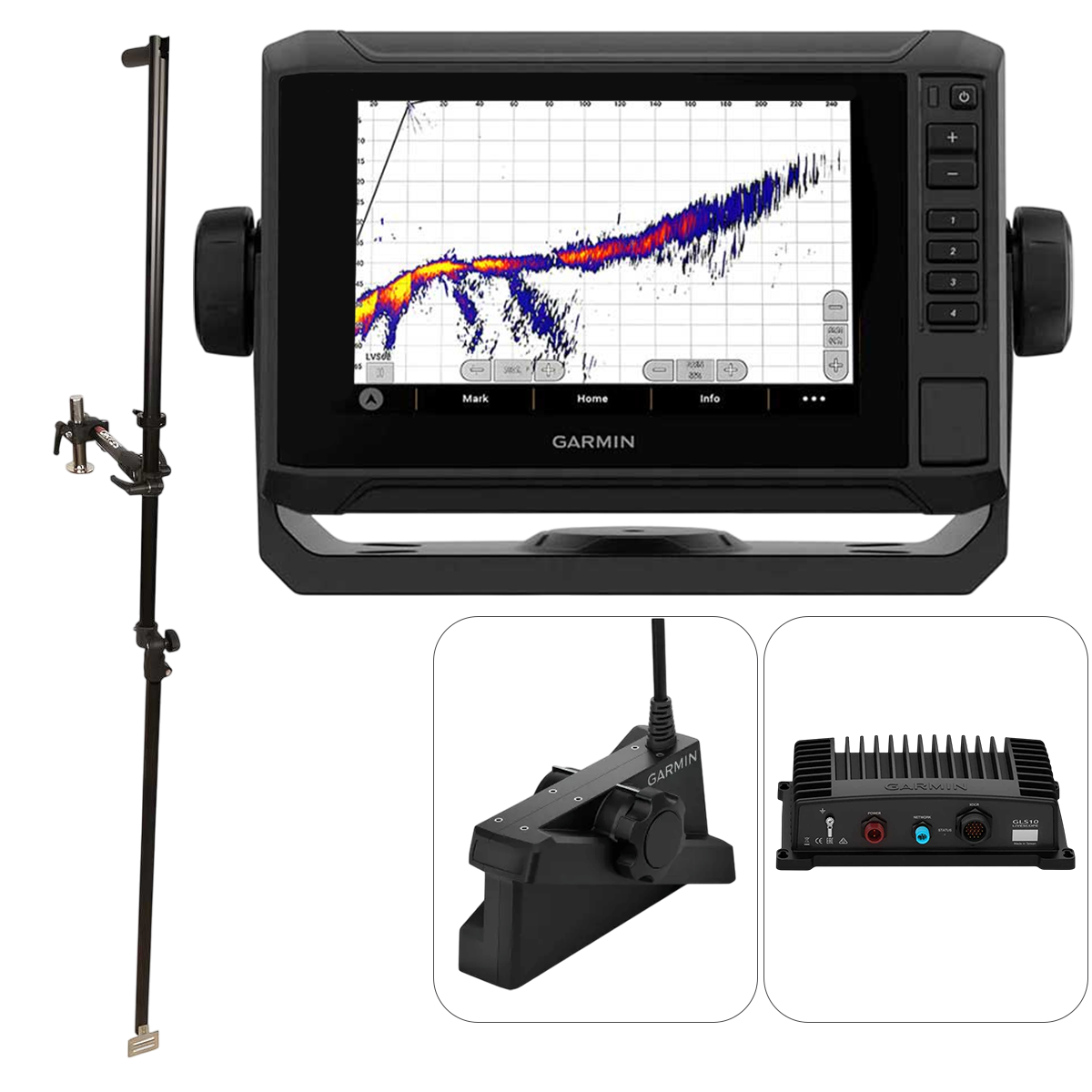 O sistema Garmin LiveScope LVS62XR, juntamente com o módulo de sonda GLS10, proporciona uma visão em tempo real do fundo do mar e dos peixes com uma nitidez de imagem notável.
