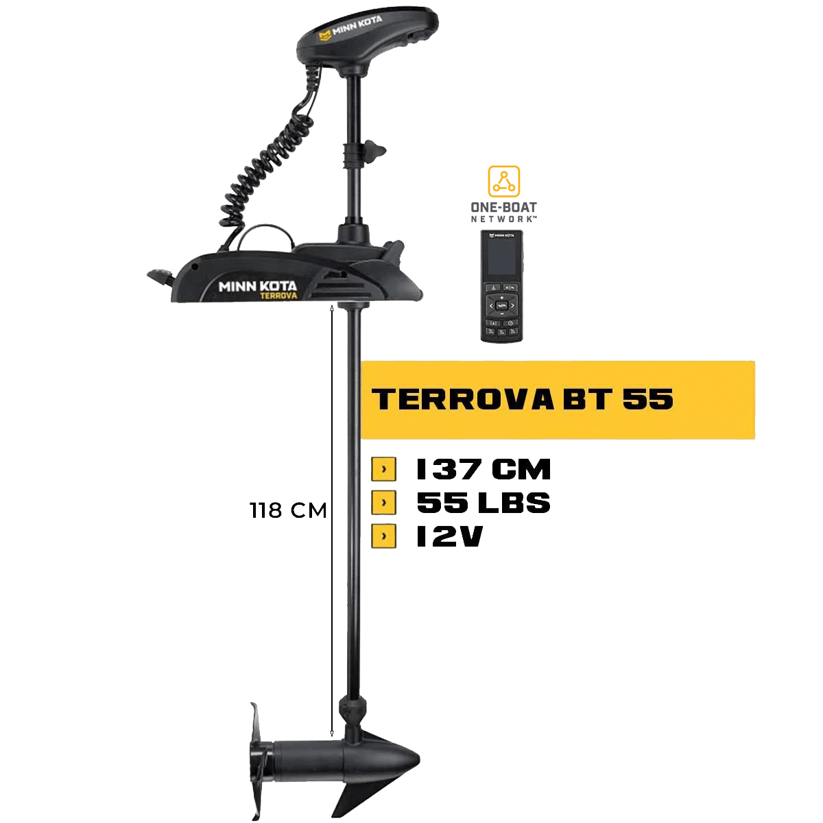 Esta versão tem um comprimento de eixo do motor de 137 cm sem sensor e uma potência de 55 lbs, mas o motor de proa Minn Kota Terrova 55 Lbs GPS também está disponível com outros modelos numa versão com um sensor DSC integrado (Dual Spectrum Chirp) ou em 114 cm com um sensor.
