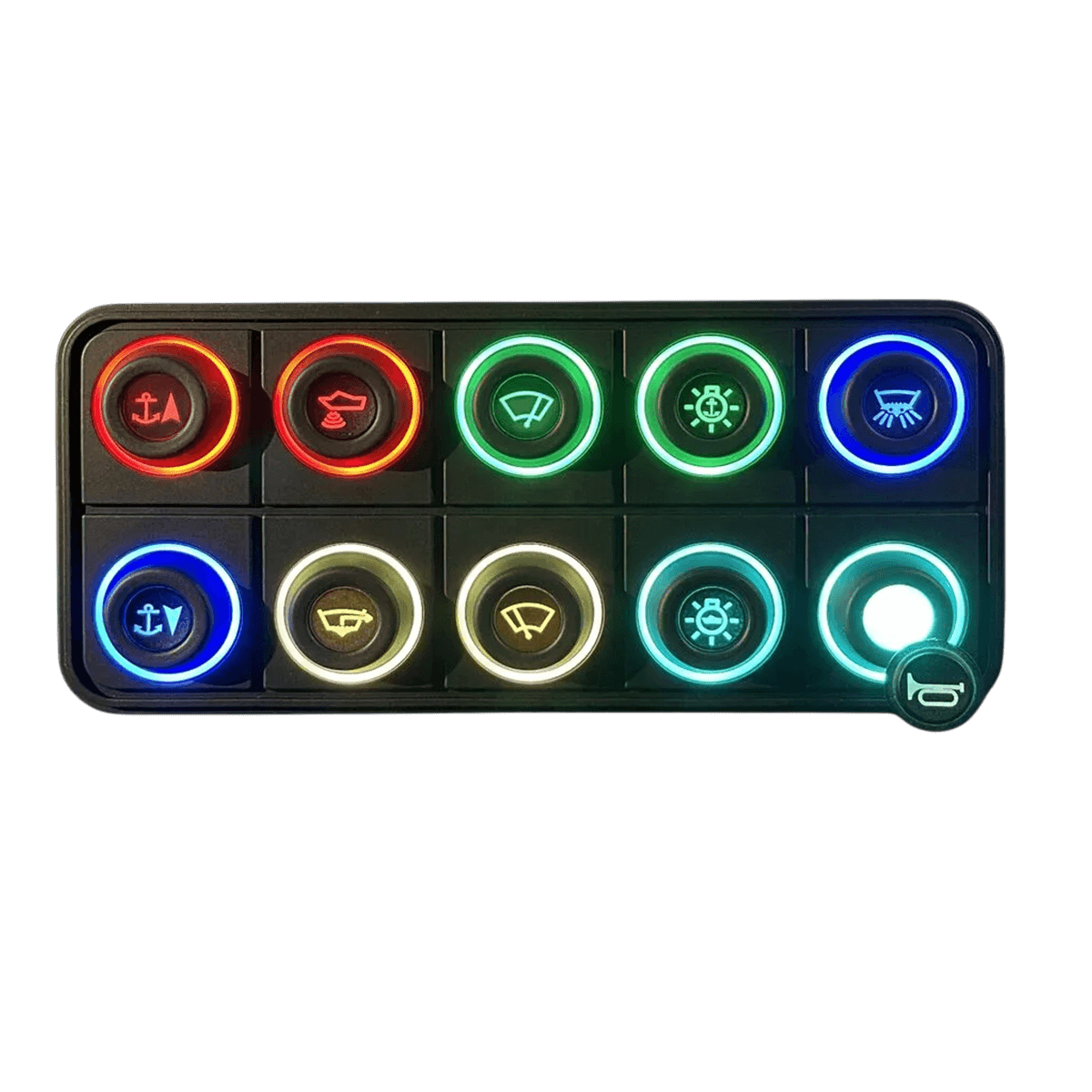 O teclado Blink Marine PowerKey Pro de 10 teclas Ø15 mm centraliza as funções de bordo. As suas teclas amovíveis aceitam pads intercambiáveis, personalizáveis e gravados a laser. Os ícones são retroiluminados por LEDs e os LEDs RGB indicam o estado. Caixa compacta e impermeável para montagem à superfície ou à face, vertical ou horizontal.