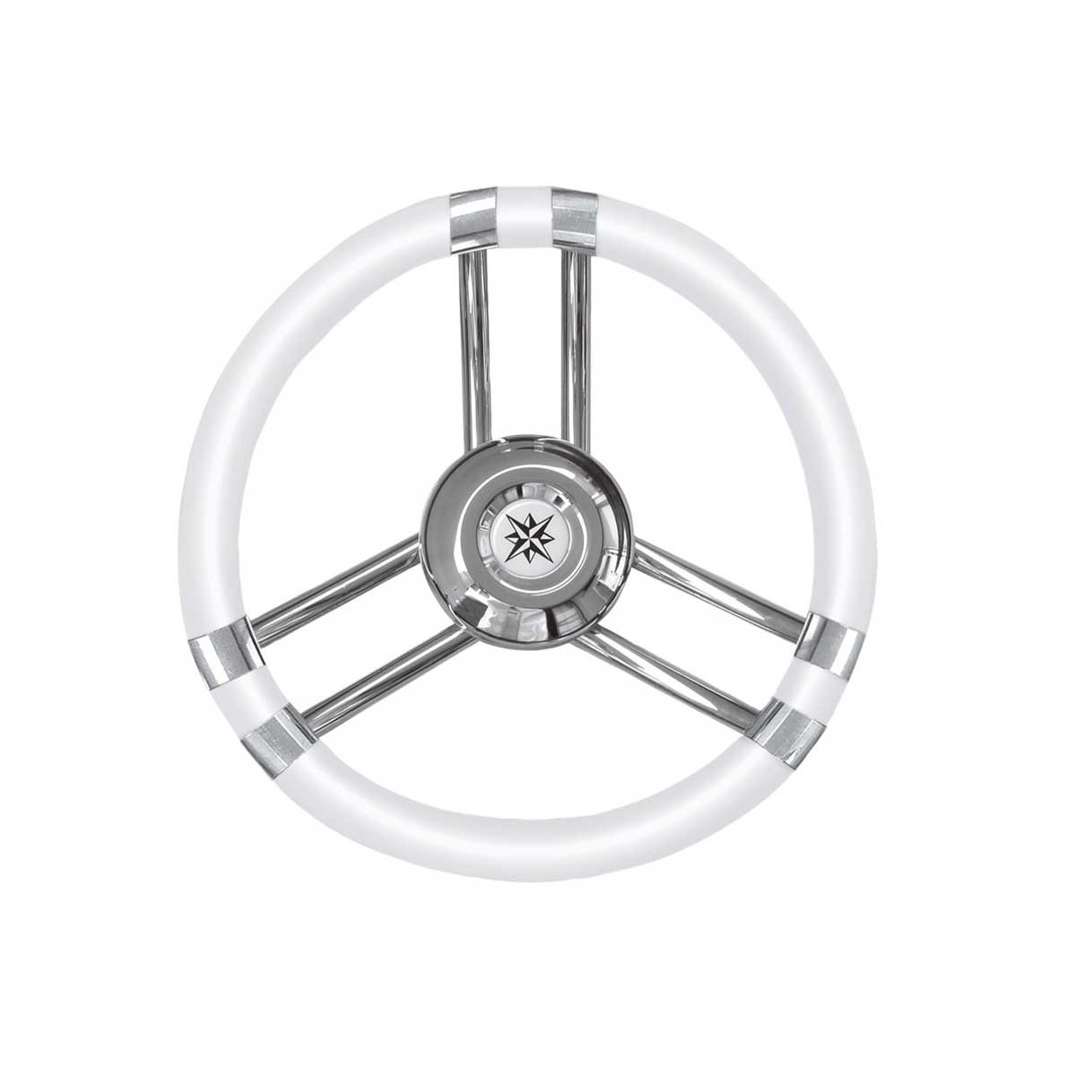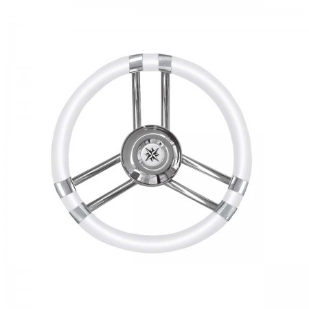 O volante T21 tem três raios em aço inoxidável e uma coroa branca de 35 cm Ø em poliuretano flexível para uma melhor aderência e resistência ao mar.