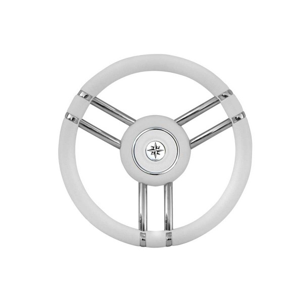 O volante Apollo tem três raios de aço inoxidável polido e uma coroa de poliuretano branco de Ø 35 cm para uma melhor aderência e resistência ao mar.