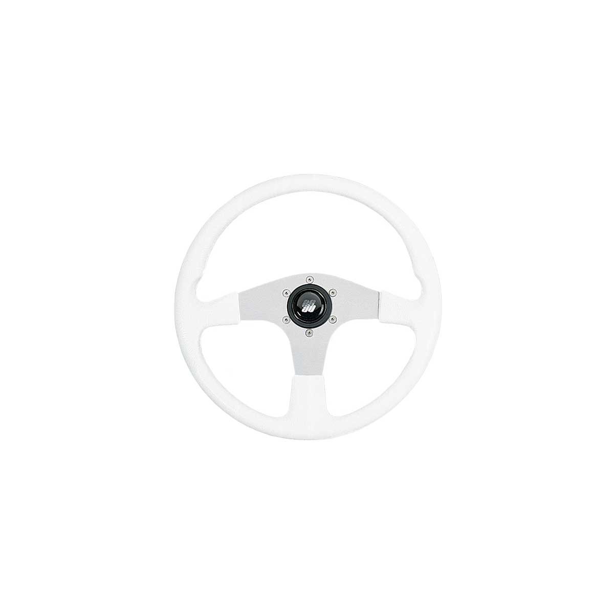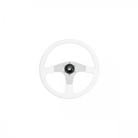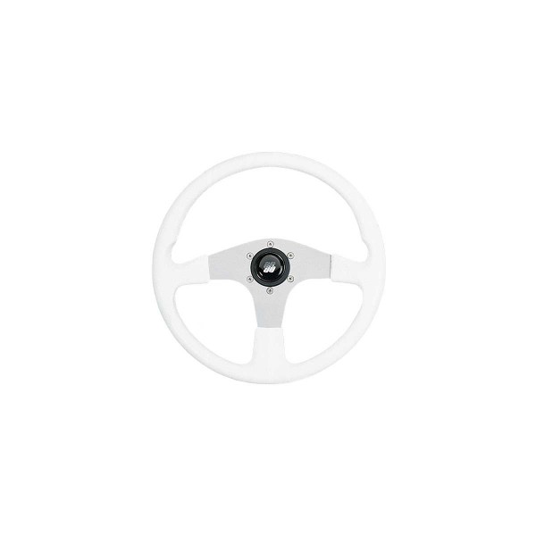 O volante Corsica Ultraflex, com a sua coroa em PVC branco e raios em alumínio anodizado prateado, oferece uma aderência suave ao toque para um conforto de condução quotidiano.